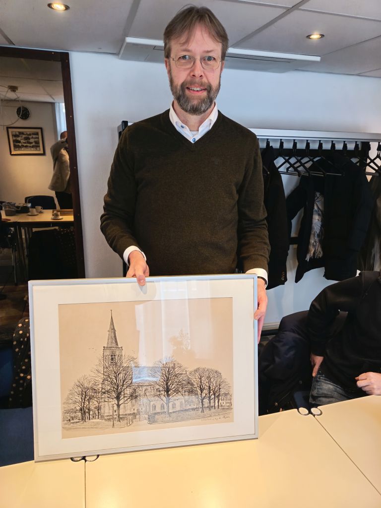 Zo vertelde Eric Jan ter Steege, dat de pentekening van Otto Dicke met de Singelkerk in 1980 door de bekende Dordtse kunstenaar is gemaakt ter gelegenheid van de opening van het politiebureau aan de Kievitsweg.