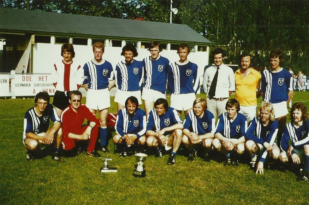 Zo weer een prijs(je) binnen! Rijsoord heeft zo te zien het Zilveren Molentoernooi gewonnen bij De Zwerver te Kinderdijk. Anton van der Steen heeft een fraai keeperstenue aan. Naast Anton staat Jaap Roos, Louis Verschoor, Klaas Blaak, Piet de Wind, trainer Leo van Graafeiland, grensrechter Jo de Zeeuw en Hans Verschoor. Gehurkt van links naar rechts: Leo Lagendijk, verzorger Arie van Vugt, Wout Bestebreurtje, Piet Stok, Kees Rutten, Anthon den Boer, Jan de Koning en Dammes Dorsman.
