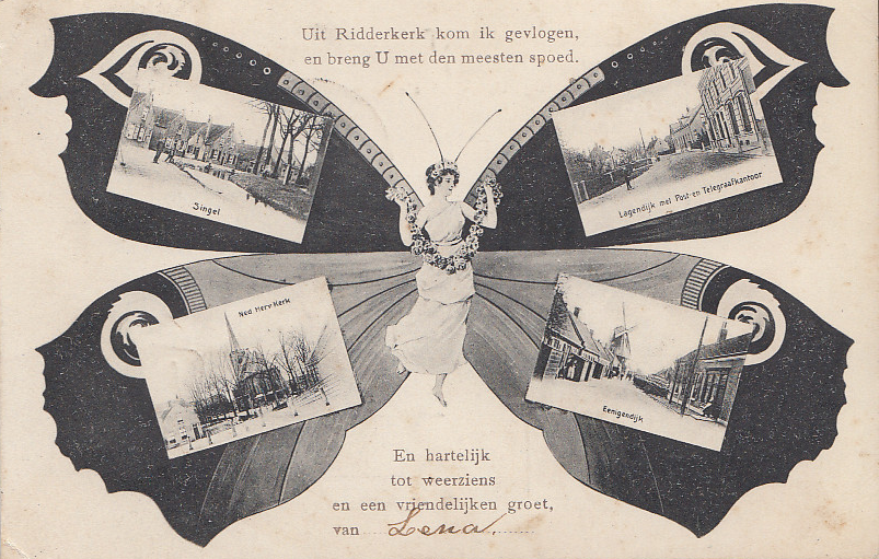 Vroeger kocht je van het land, de stad of het dorp een ansichtkaart. Wij schreven die dan vol met tekst om aan te geven hoe mooi het daar was, om te vertellen van onze belevenissen in de vakantie. Om veel van die ansichtkaarten gaat het tijdens de tentoonstelling ‘Ridderkerk ingelijst en in ansichtkaarten’. Er zijn in Ridderkerk meerdere personen die als hobby ansichtkaarten verzamelen. Wij konden kiezen uit maar liefst zo’n 1600 kaarten. Hiervoor hebben we in de Oudheidkamer niet voldoende ruimte, om die allemaal ten toon te stellen. We moesten dus een selectie maken. We vonden zelfs ansichtkaarten uit 1895! Meerdere ansichtkaarten zijn bijna helemaal vol geschreven en daardoor moeilijk te lezen. We hebben daarom de ansichtkaarten vergroot. Er zijn ook ansichtkaarten waar alleen het adres is ingevuld. Soms niet eens met een straatnaam en huisnummer. De postbode had geen enkele moeite om die kaart te bezorgen! Ook leuk om naar de postzegel op de kaart te kijken. Waar is de tijd gebleven dat een postzegel van 1 cent voldoende was om de kaart te versturen? Alle ansichtkaarten hebben een link met Ridderkerk.